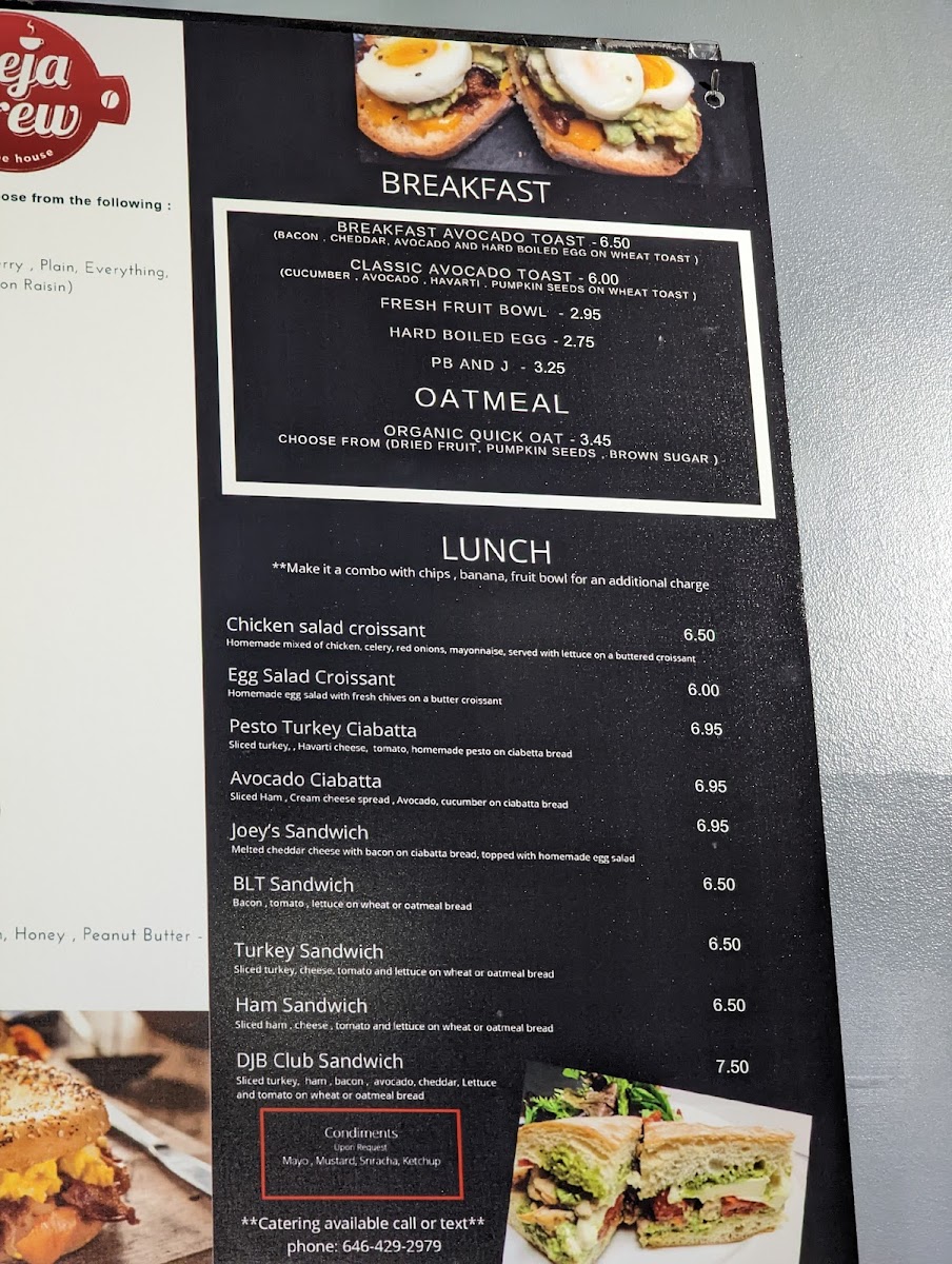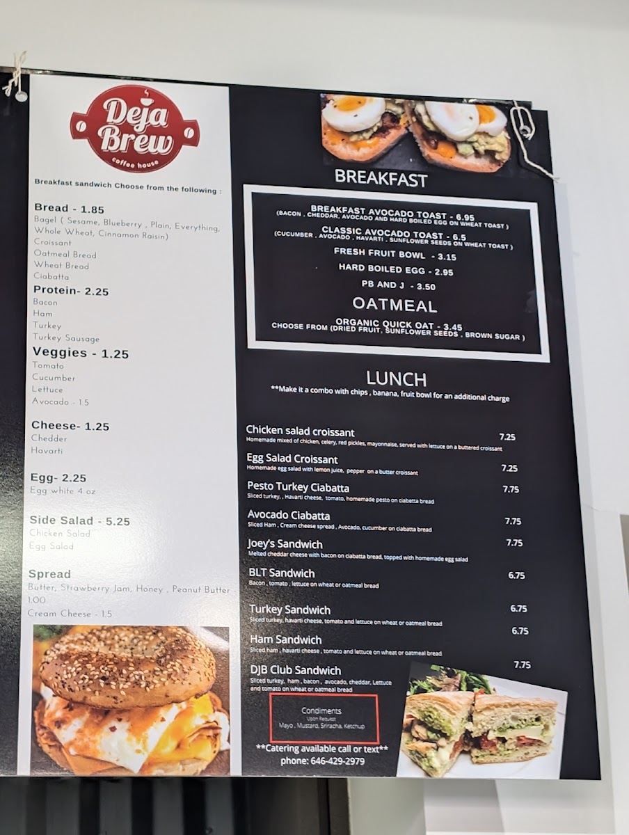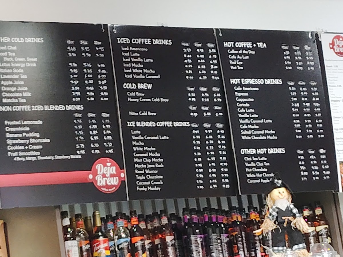 The moment you step through the door, you are greeted with the rich aroma of freshly brewed coffee. Deja Brew offers an impressive selection of coffee options, including robust drip coffee, velvety lattes, and delightful flavored drinks like their seasonal Gingerbread and Pumpkin Brulee lattes. Each cup is crafted to perfection, whether you prefer the simple elegance of an Americano or the decadent sweetness of a White Chocolate Mocha.